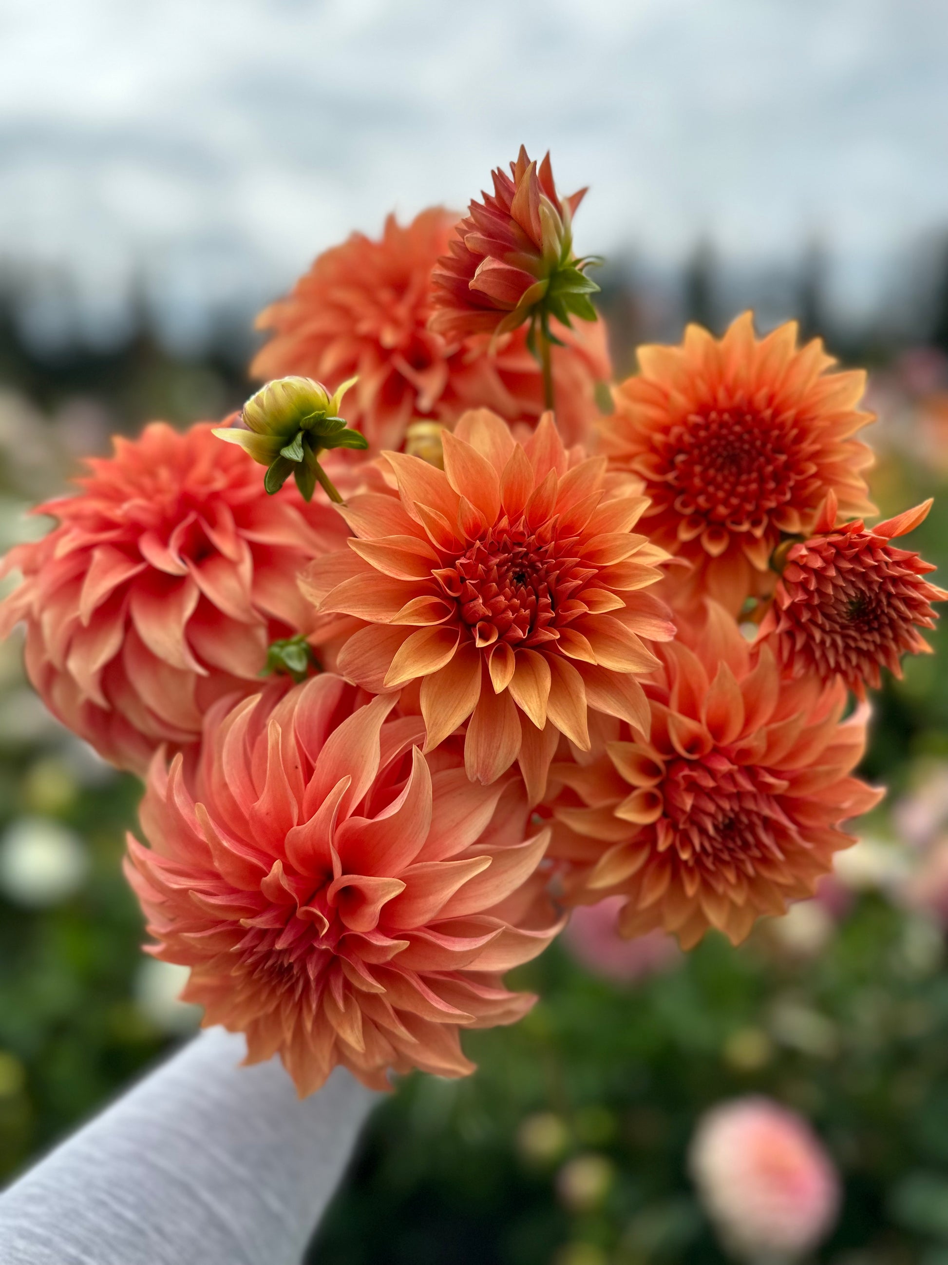 Such a beautiful orange dahlia that glows in the field atop towering stems.
