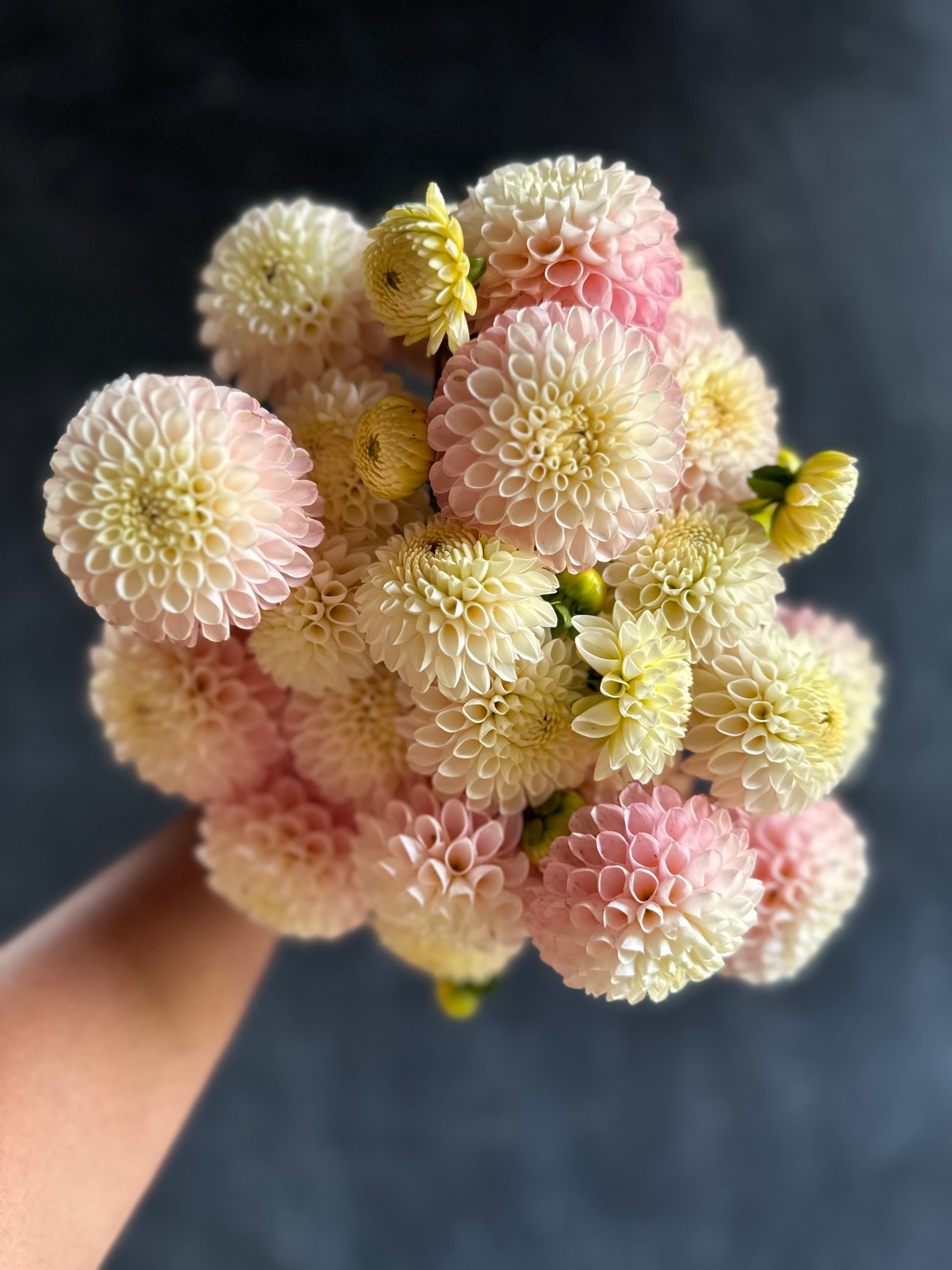 One of my absolute favorites. It is such a work horse in the garden which produces the most beautiful and the softest blush colored mini ball dahlias.