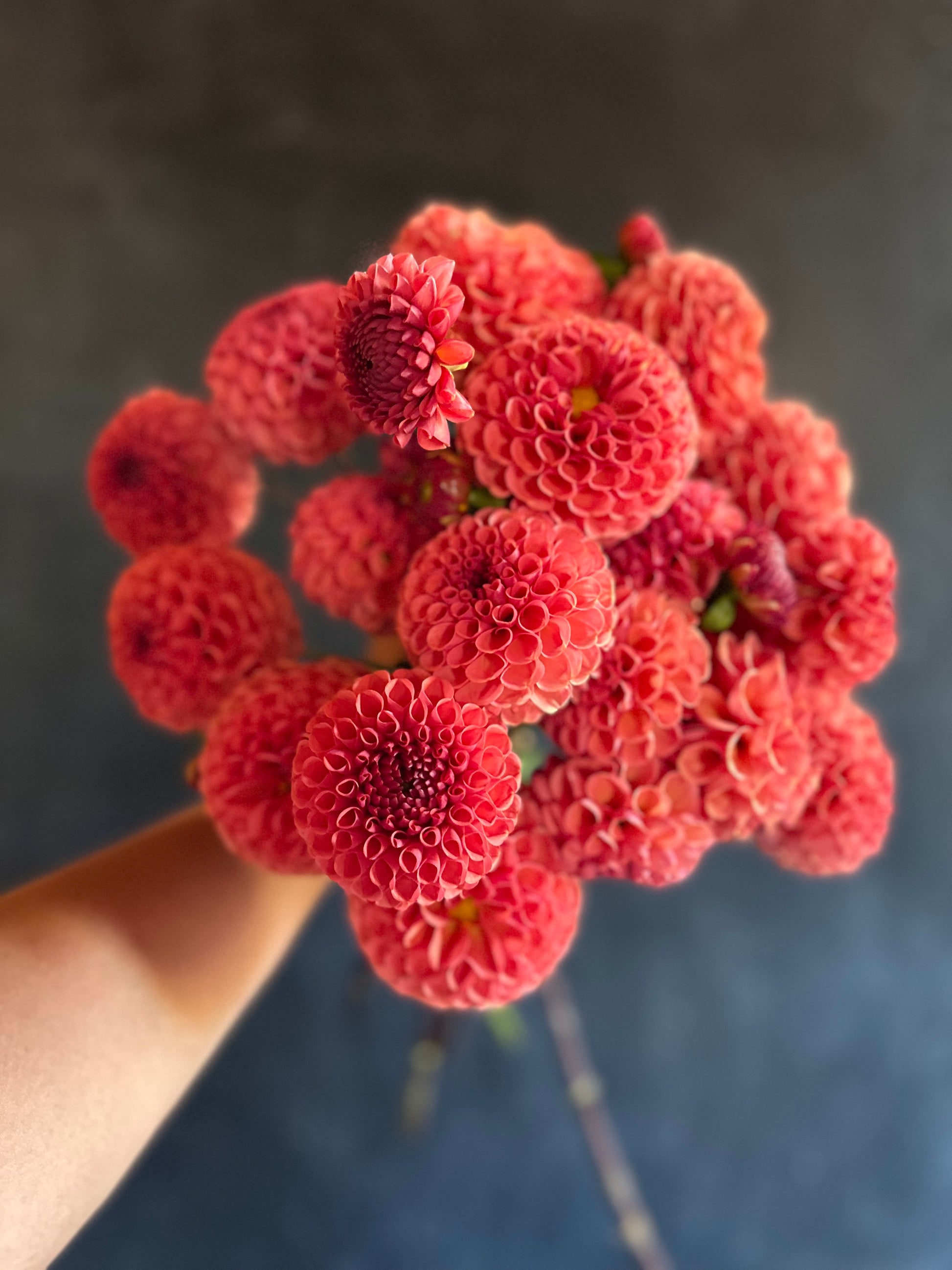 A ball form dahlia with rusty orange blooms. The plant grew to roughly around 3.5 feet but produced an enormous amount of blooms.