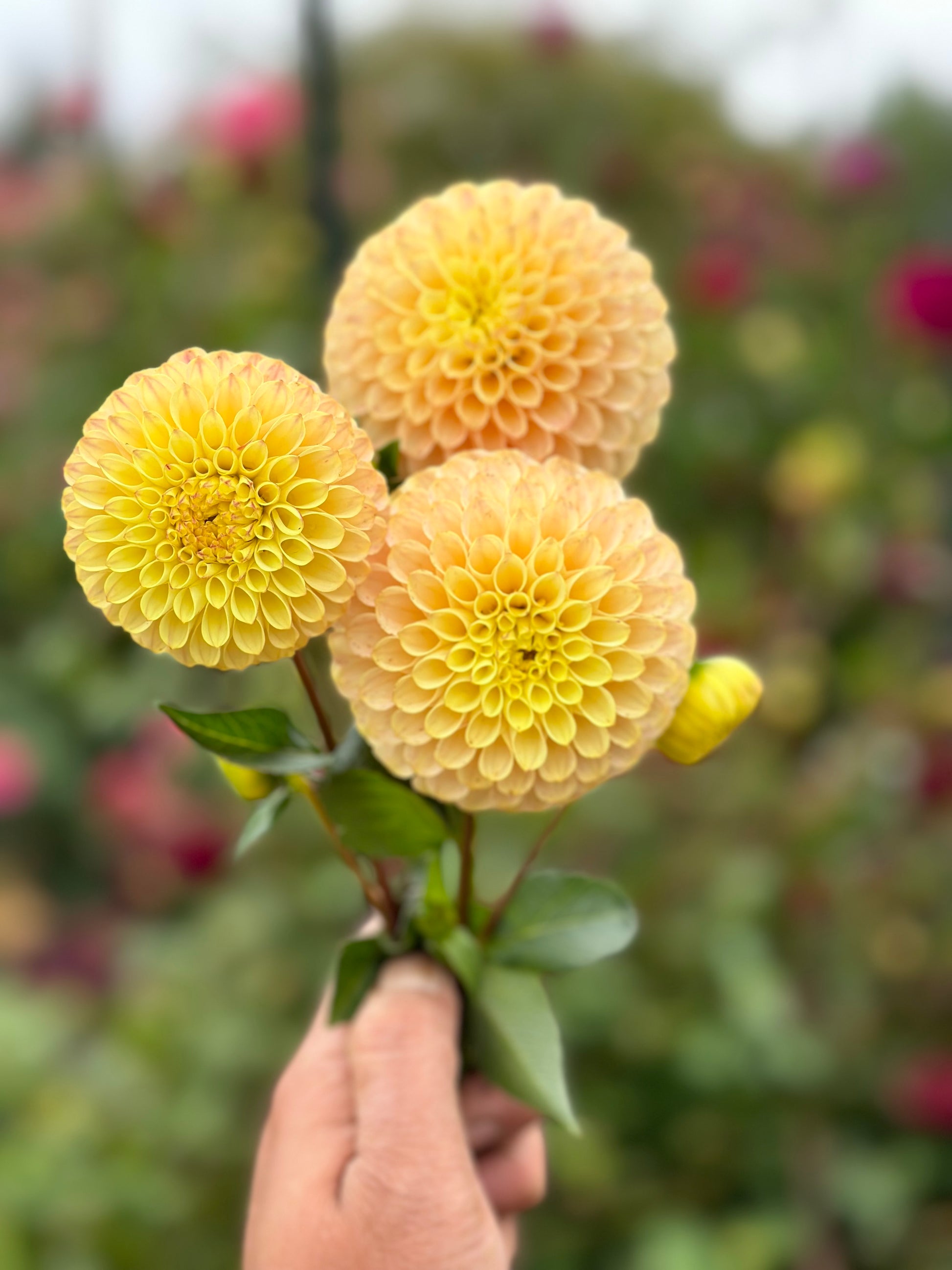 A soft peach mini ball dahlia with a kiss of pink on the center. Sometimes it exhibits specs of dark pink on the petals.