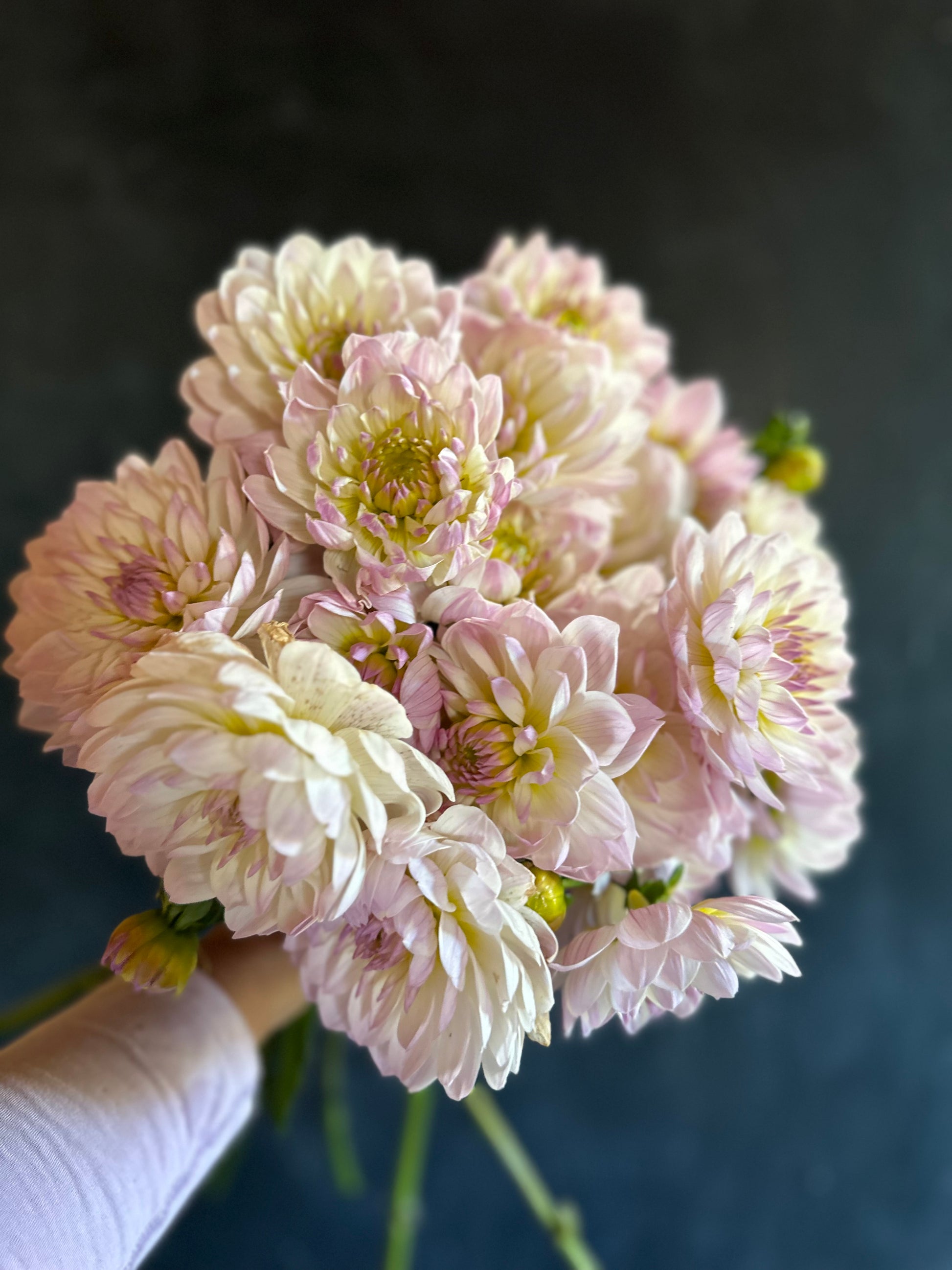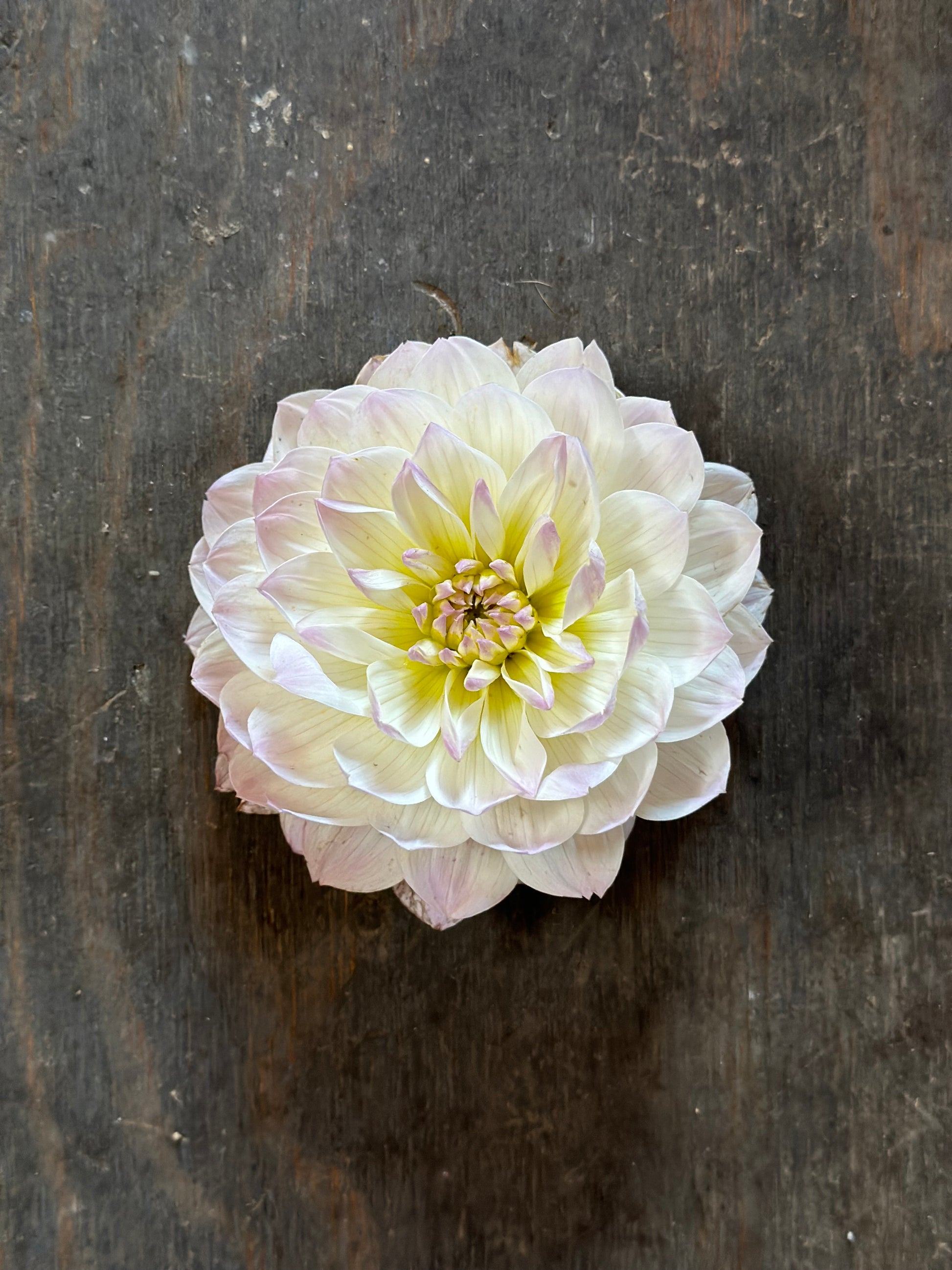 A stunning white waterlily dahlia with a kiss of lavender. If you love waterlily, you need to grow this one.