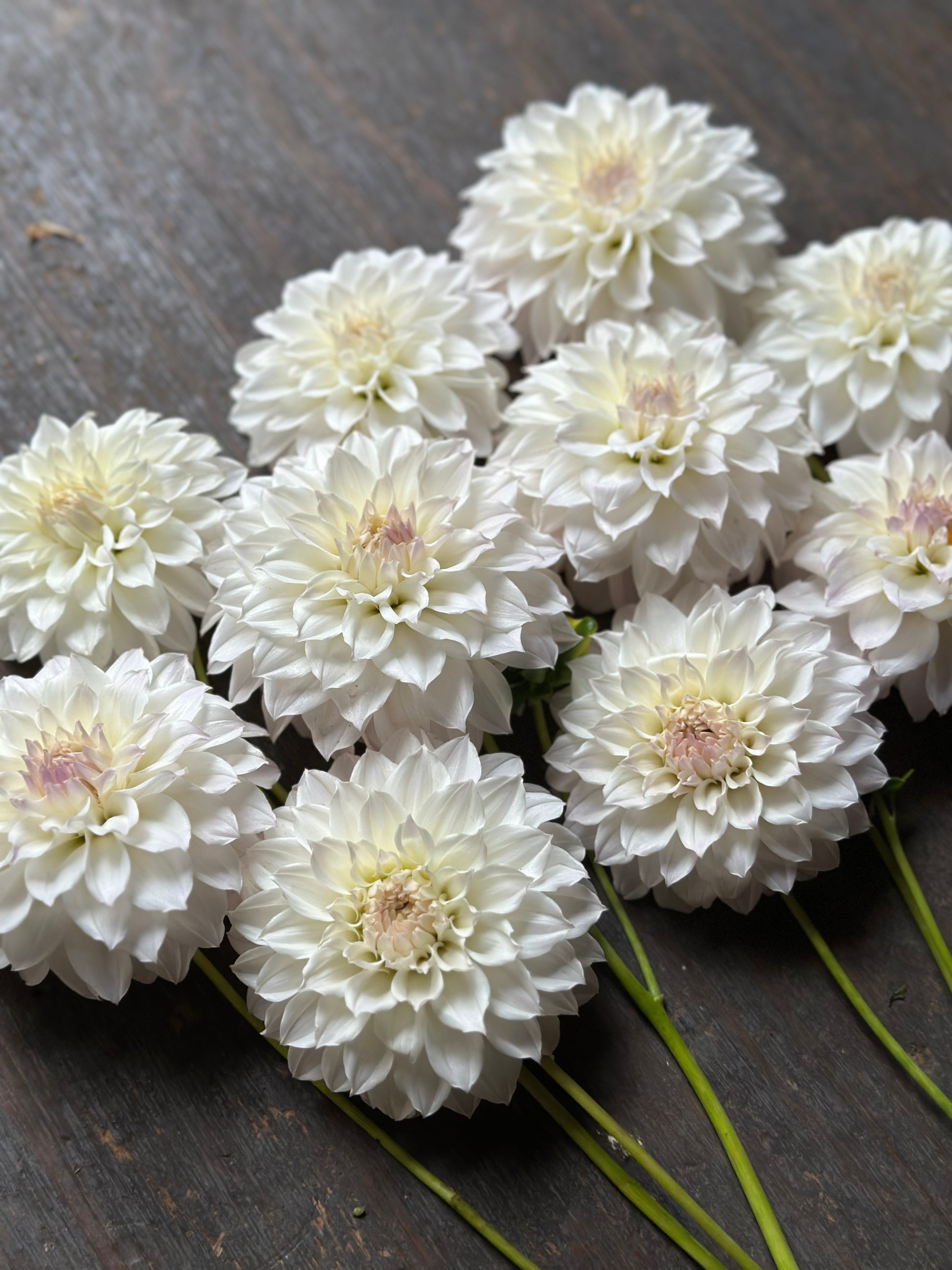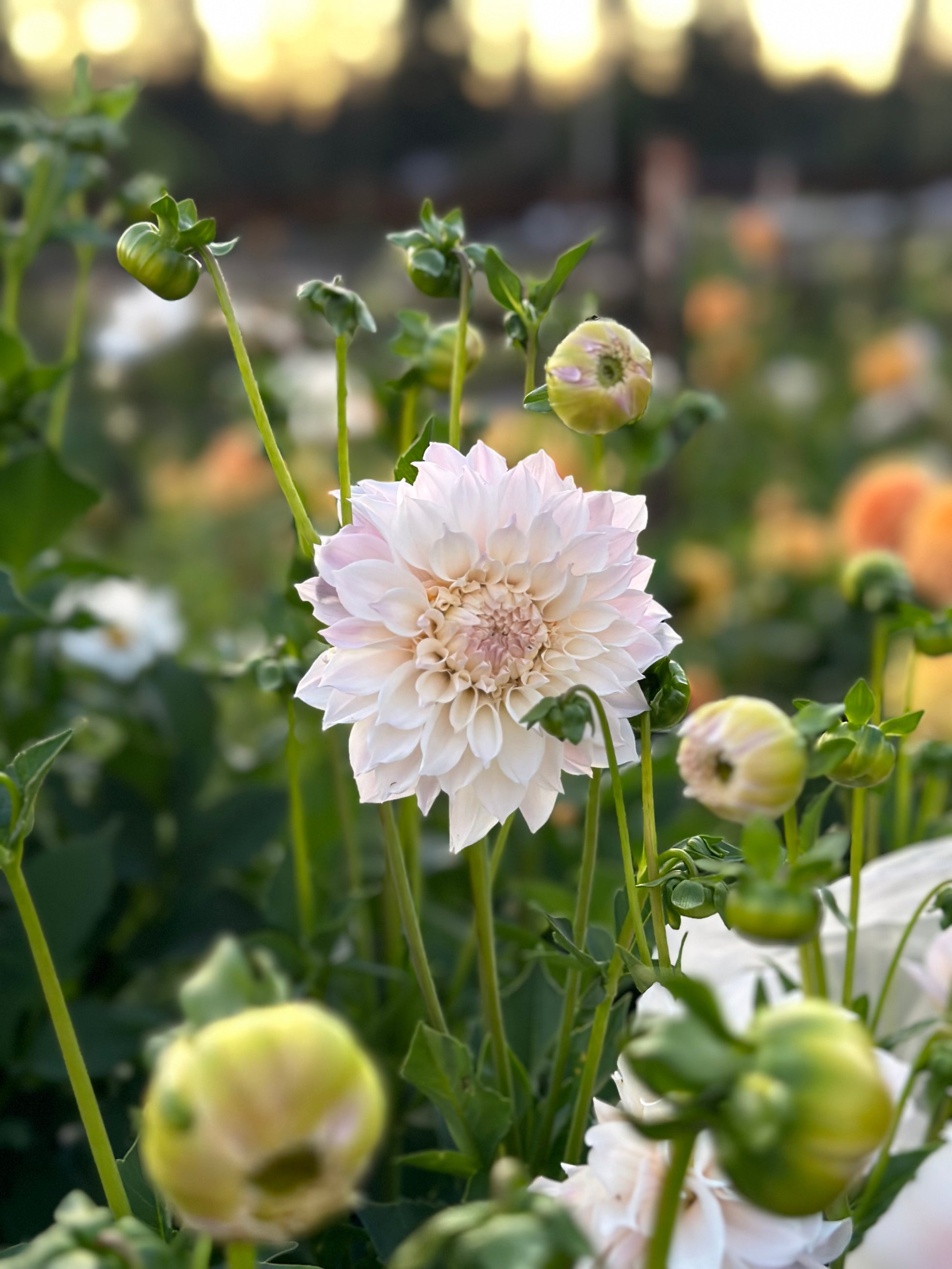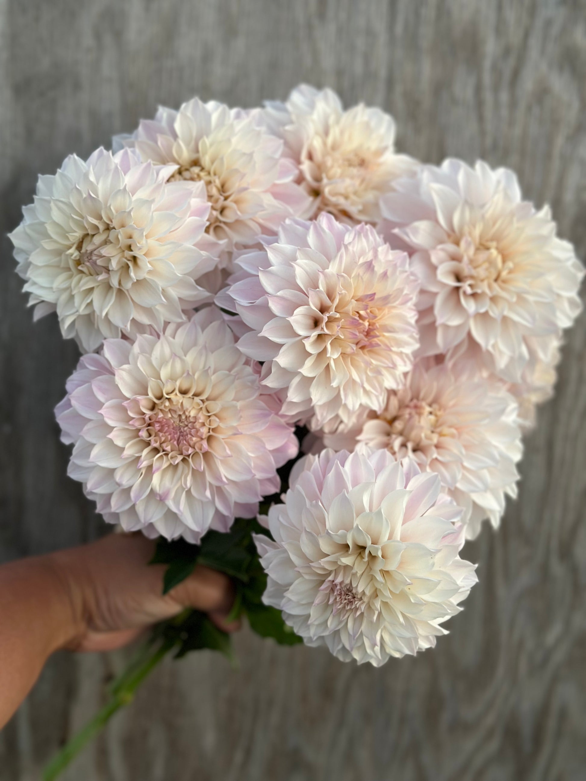 This seedling was our go to for events such as weddings. It is super vigorous with long stems. It puts out gorgeous 4" blush blooms growing at about 4- 4.5 feet tall. We were still debating if we should release this beauty because we felt it did not have enough petals but after careful consideration, a few friends telling us to keep growing it and to release it, we've decided to go ahead and ramp up production this year and release it for the 2026 season.